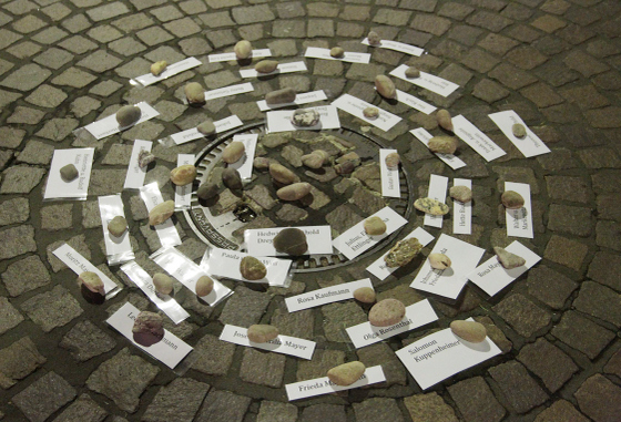 Zum Ende der Gedenkstunde wurden die Namen der in Konzentrationslagern ermordeten Juden verlesen. Karten mit den Namen der Ermordeten wurden im Kerzenkreis niedergelegt. Ulla Oelschläger las noch ein Gedicht einer jüdischen Dichterin vor, bevor die Gedenkfeier mit dem Geläut der Glocke von St. Alexander ausklang.